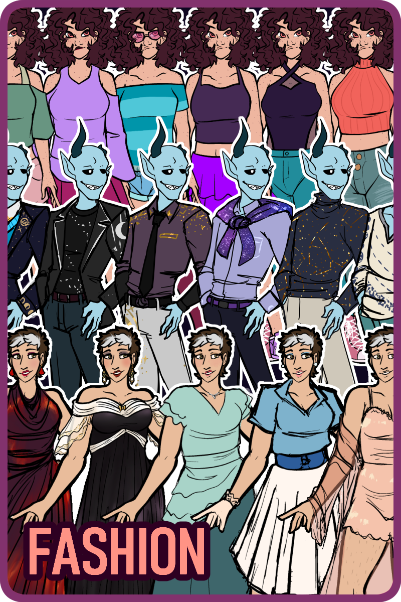 Before I became a full-time artist, I worked for a few years as a stylist at mall fashion stores, which I feel has helped me a lot with expanding my mental wardrobe capabilities, especially for creating mundane outfits without going overboard or becoming boring.I love using this skill set to design outfits for characters, whether I'm laying out a whole days of the week wardrobe or designing something more impractical or fantastical, drawing inspiration from a variety of fantasy and science fiction influences.